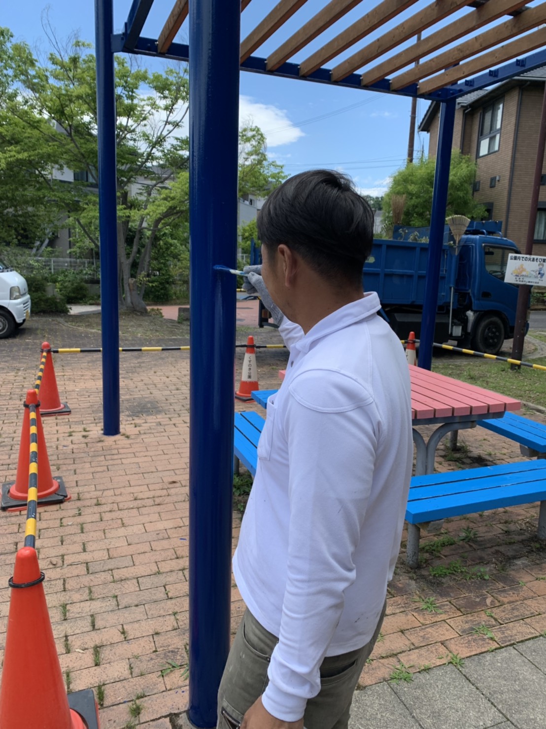 公園ボランティア活動【2019年6月】こんにちは。 今年の梅雨は突然の大雨が降りますね。 さて今回(6月16日)は前回に引き続き、和泉市 みずき台2号公園に行ってきました! この日は昨日の雨のお陰か、風が気持ちいい中での作業となりました。 職人さんは一人での参加でしたが、弊社の従業員と力を合わせて とても綺麗に完成いたしました! 夏に向けて、青空によく似合う綺麗な青色に生まれ変わりましたね。 熱中症対策の為、7月8月はお休みさせて頂きます。 次回は9月を予定しておりますので、是非お楽しみに! 一覧に戻る